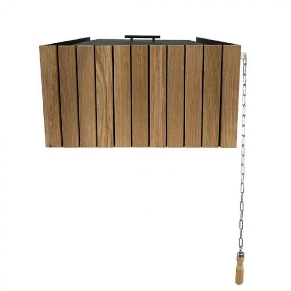 Для ценителей контраста ЭВЕРЕСТ предлагает обливное устройство, позволяющее в течение короткого времени получить массив холодной воды, достаточной для создания температурного перепада по всему телу. Обливное устройство EVEREST WOOD ДУБ представляет собой бак из нержавеющей стали, автоматически наполняемый водой. Количество воды в баке регулируется с помощью клапана подачи воды. Максимальный объём воды в баке – 15 литров. Бак обливного устройства устанавливается на высоте 2-2,2 метра. Вода для облива после парилки подаётся с помощью рукоятки на цепи. Широкое основание бака с большим количеством мелких отверстий обеспечивает оптимальный по размеру и интенсивности поток воды. Равномерная подача большого объёма воды обеспечена за счёт трех выпускных клапанов, одновременно открывающихся при потягивании рукоятки вниз.