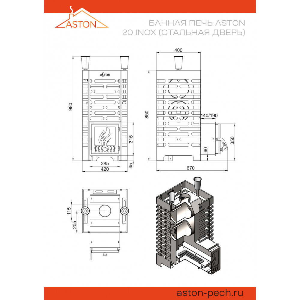 Технические характеристики Печь для бани ASTON 20 INOX с баком на трубе 50л Ø115 (AISI 439)