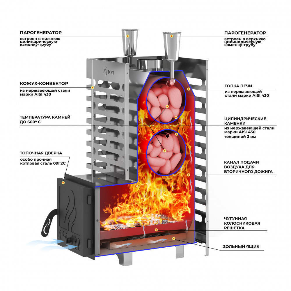 • Линейка печей ASTON из нержавеющей стали рассчитана на установку в парные объёмом от 6 до 22 м3