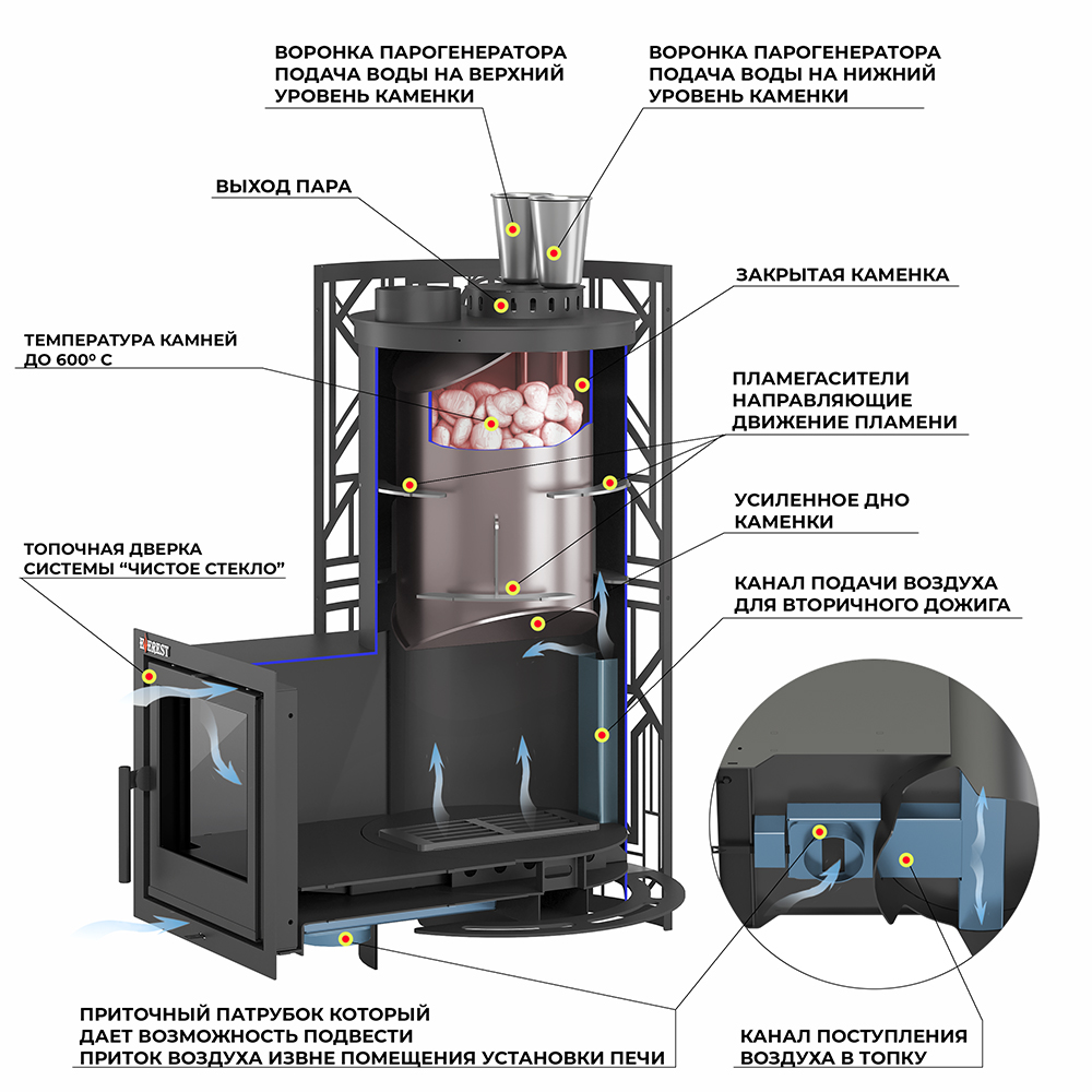 Печь для бани EVEREST Steam Master GALAXY 18 (226М) особо прочная котловая сталь (09Г2С) изготовлена из нержавеющей стали и предназначена для установки в частные и коммерческие бани. Конструкция печи включает в себя закрытую каменку из нержавейки марки AISI 430 толщиной 4 мм, расположенную в верхней части топки. Каменка оригинальной формы исключает накопление сажи в дымоходе и исполняющая функцию пламя гасителя так как размещена прямо на пути пламени и дымовых газов что позволяет нагреть камни до температур свыше 600 ºС. Внутри корпуса печи предусмотрены пламегасители, они направляют пламя во круг закрытой каменки образуя вихревой огненный поток тем самым увеличивая кпд печи и равномерно нагревая заклад каменки. Отдельного внимания заслуживает система подвода воздуха в колосниковую зону и в зону вторичного дожига, патрубок расположен в нижней части топочного туннеля позволяет подводить воздух из вне помещения. На Печь имеет две заливные воронки которые дают возможность подавать воду на разные уровни заклада, тем самым получать максимальное количество мелкодисперсного пара.