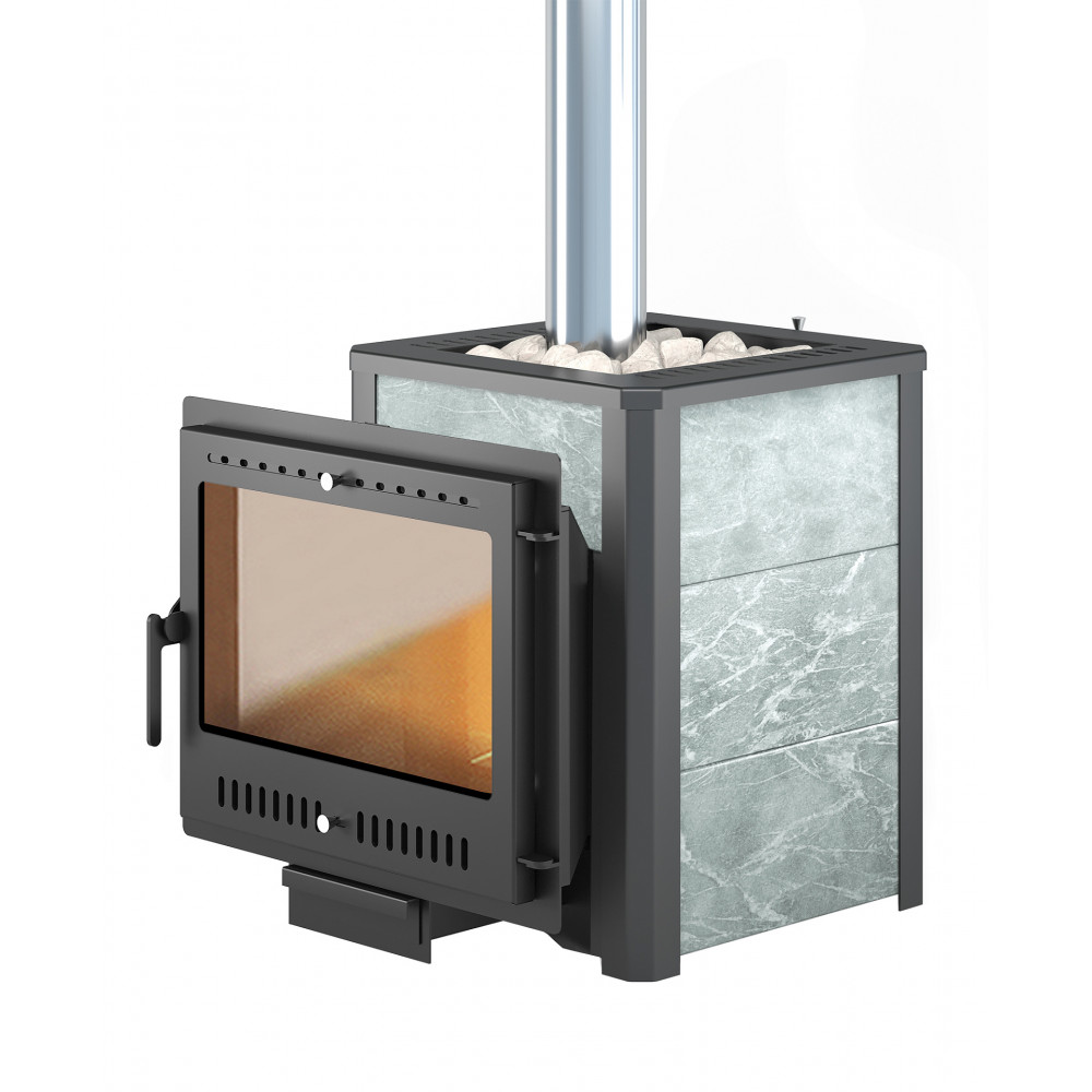 Преимущество печи в том, что топка печи состоит из 3-х ЧУГУННЫХ элементов. На стыке между ними используется керамический шнур с рабочей температурой 1200 градусов. То есть топка печи абсолютно герметична! Для фиксации деталей между собой применяется болтовое соединение, что даёт 100% гарантию безопасности при эксплуатации. Конвекционно–вентилируемая облицовка, изготовленная из экологически чистой горной породы , который обладает большой теплоёмкостью, что позволяет камню в короткие сроки нагреваться и максимально долго удерживать стабильную температуру в парильном помещении, а также гасить жёсткое инфракрасное излучение Камень обладает исключительными лечебными свойствами: помогает при головных болях, при нестабильном артериальном давлении, при простудных заболеваниях, воспалительных процессах в почках и пищеварительной системе, снимает повышенную возбудимость и нервозность, сглаживает эмоциональные всплески. Облицовка из натурального камня при нагреве способна аккумулировать тепло, что гарантирует максимально равномерный прогрев и сохранение тепла. Печь ВЕЗУВИЙ Легенда 16 Панорама "М" талькохлорит укомплектована чугунной каминной дверцей Везувий 505 с большим жаропрочным стеклом «SCHOTT ROBAX». Данная печь рассчитана на объем парильного помещения 8-18 м3.