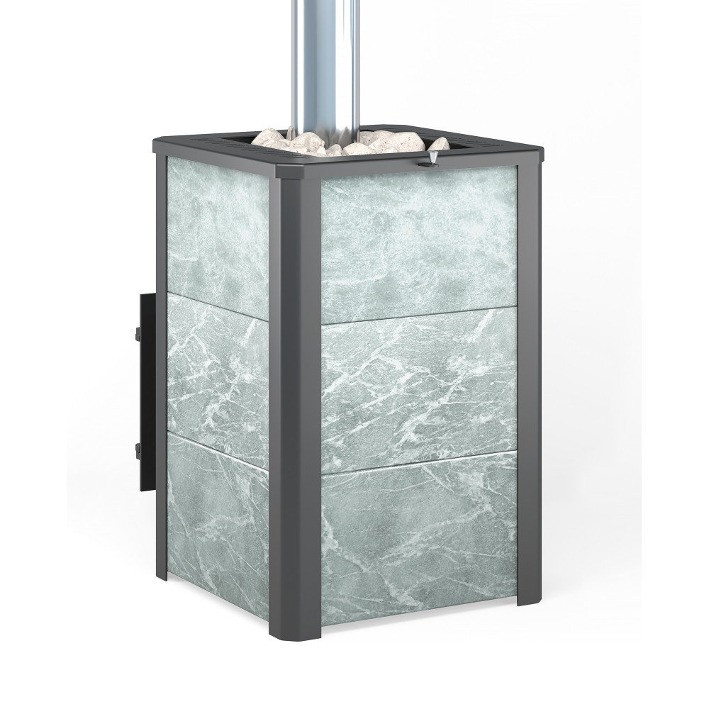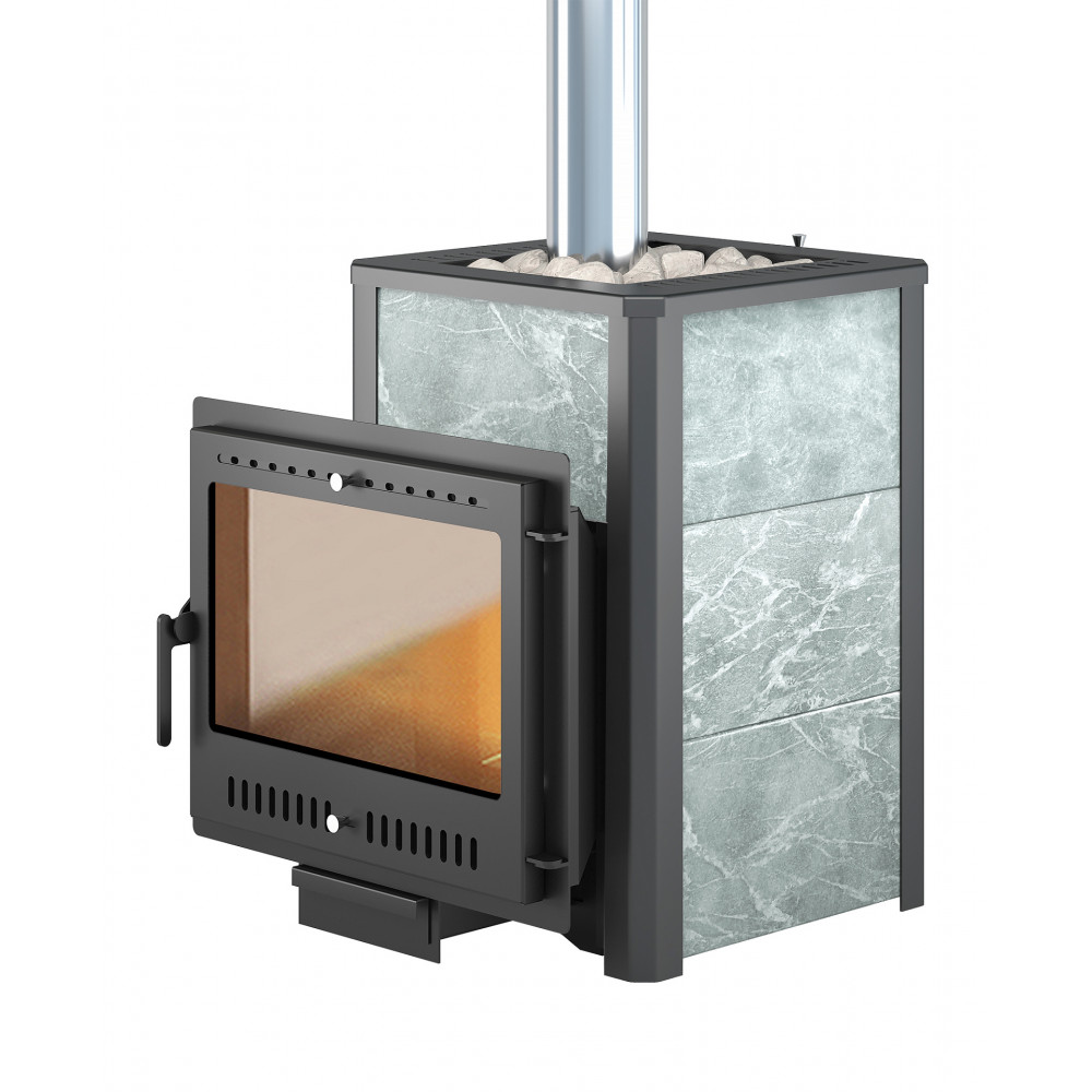 Конвекционно–вентилируемая облицовка, изготовленная из экологически чистой горной породы , который обладает большой теплоёмкостью, что позволяет камню в короткие сроки нагреваться и максимально долго удерживать стабильную температуру в парильном помещении, а также гасить жёсткое инфракрасное излучение Камень обладает исключительными лечебными свойствами: помогает при головных болях, при нестабильном артериальном давлении, при простудных заболеваниях, воспалительных процессах в почках и пищеварительной системе, снимает повышенную возбудимость и нервозность, сглаживает эмоциональные всплески. Облицовка из натурального камня при нагреве способна аккумулировать тепло, что гарантирует максимально равномерный прогрев и сохранение тепла. Банная печь Легенда 22 Панорама "М" талькохлорит укомплектован чугунной каминной дверцей Везувий 505 с большим жаропрочным стеклом «SCHOTT ROBAX», с оборудованной системой самоочистки, что позволяет визуально контролировать горение и любоваться видом живого огня. Данная печь рассчитана на объем парильного помещения 12-24 м3.