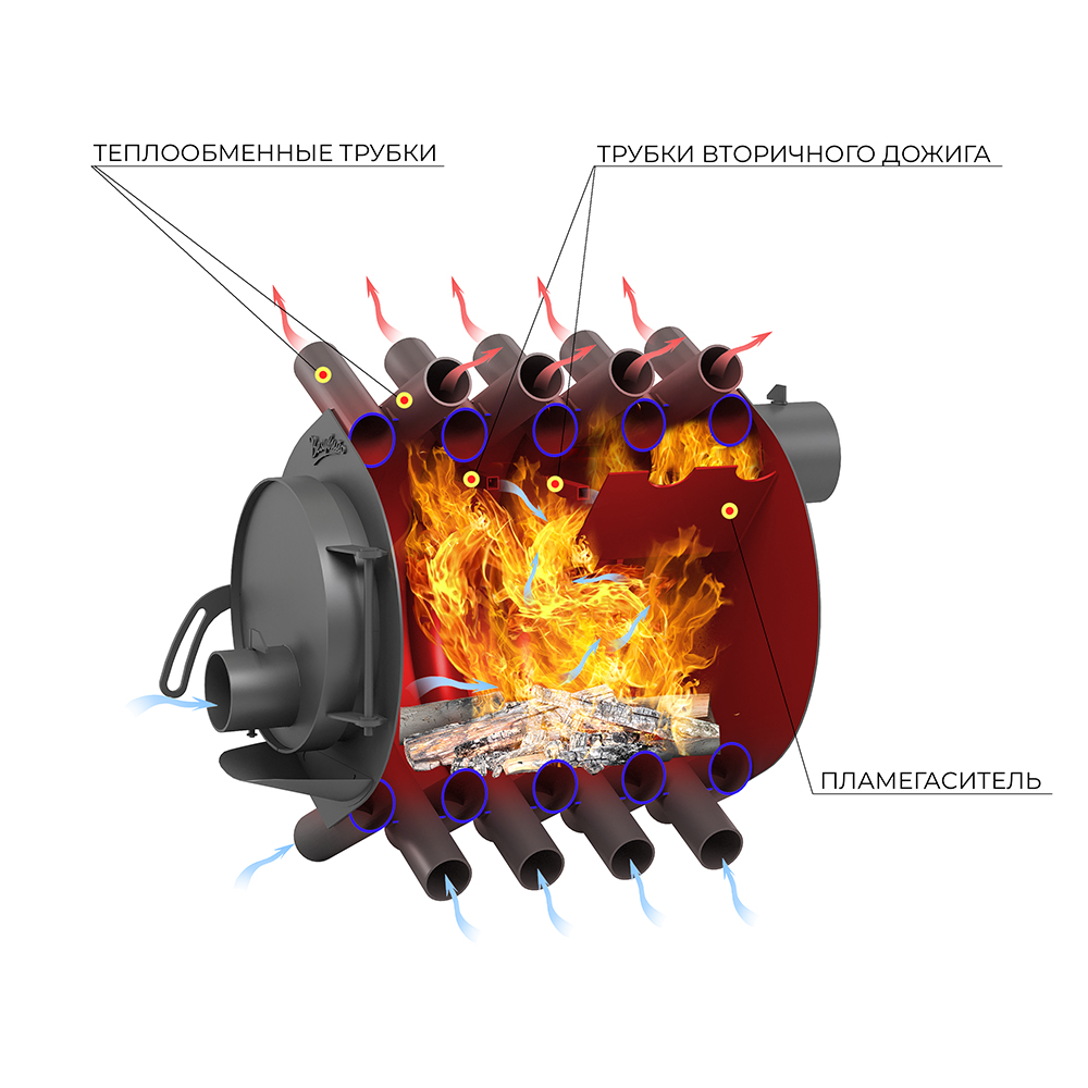 Две камеры сгорания, нижняя камера газификации и верхняя камерадожига газов, обеспечивают практически полное сгорание топлива и получениемаксимального количества энергии во время работы печи.