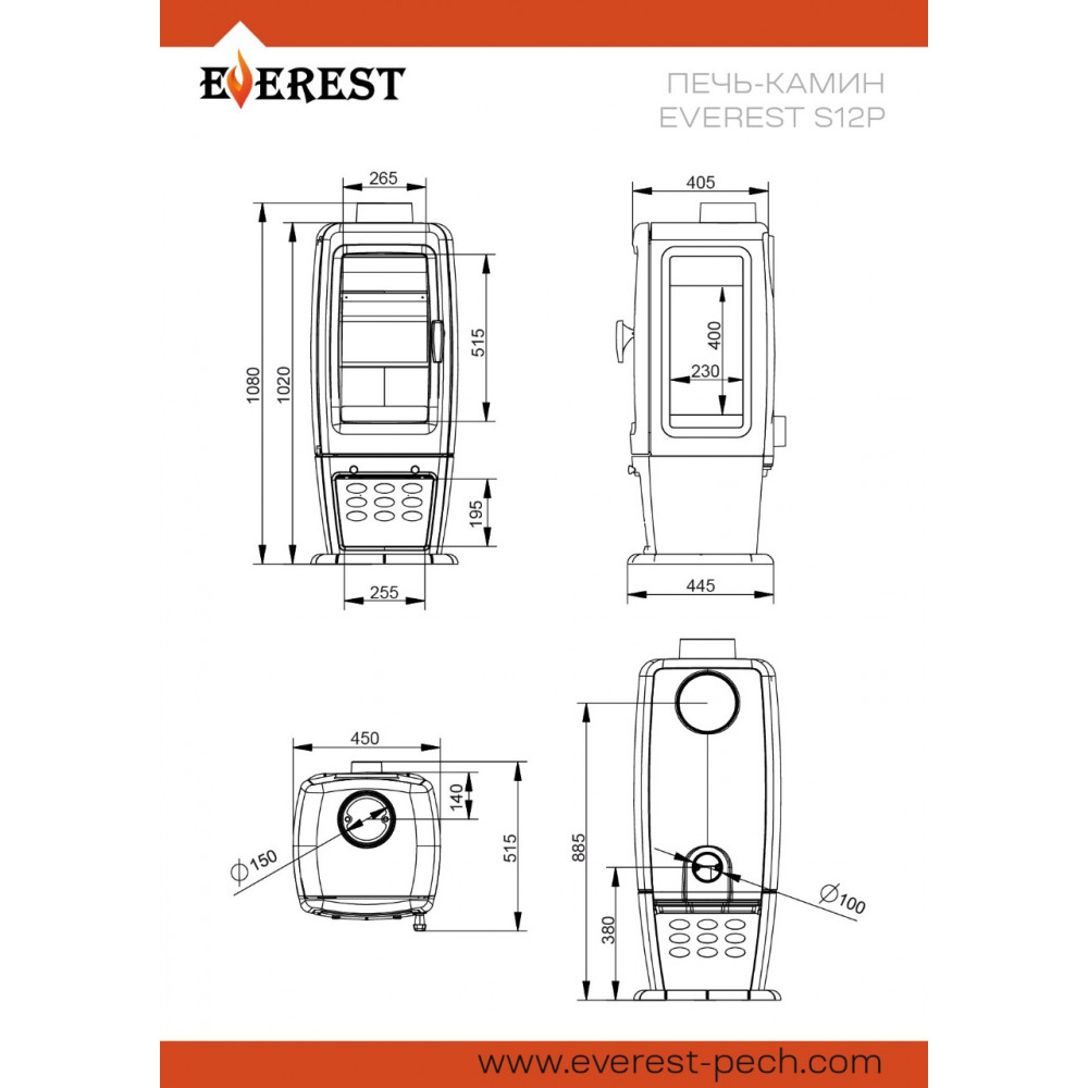 | Выход дымоходаСверху/Сзади | Глубина515 мм | Диаметр дымохода150 мм |